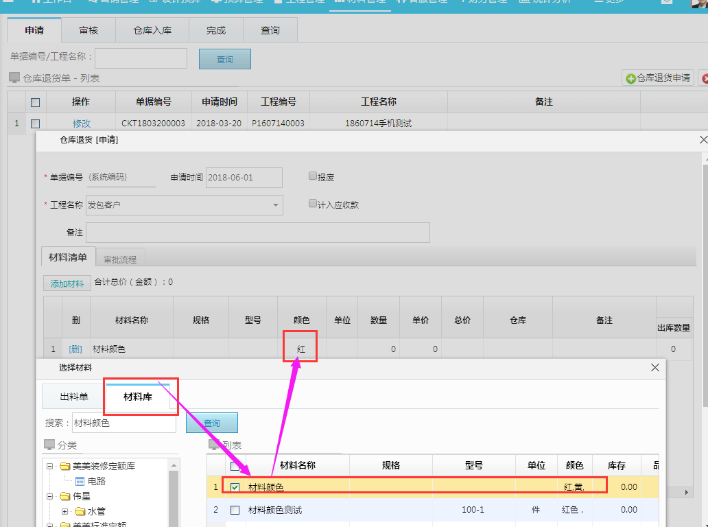 1:選中出庫單中材料:默認(rèn)材料顏色為制作領(lǐng)料/出庫單申請時選中的材料顏色;
