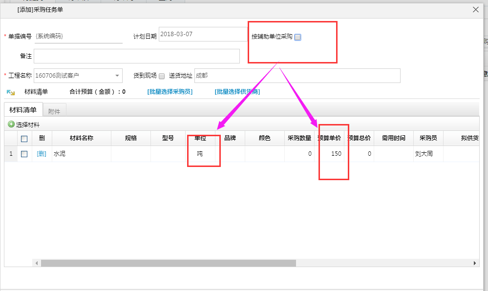 其次點開材料管理--采購任務(wù)單--選擇材料時注意勾選是否按輔助單位采購,具體請參考以下操作