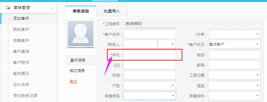 必填:在錄入客戶資料時(shí)手機(jī)號(hào)碼為必填項(xiàng),如若未填此客戶無(wú)法錄入系統(tǒng)(顯示紅色*)