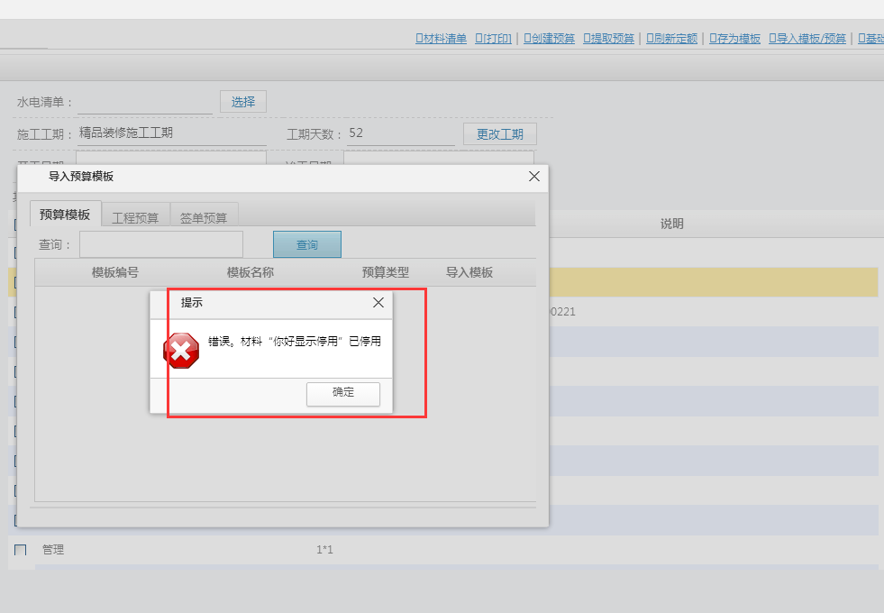 設(shè)計師在制作預(yù)算時導(dǎo)入預(yù)算會提醒設(shè)計師有關(guān)模板的導(dǎo)入信息: