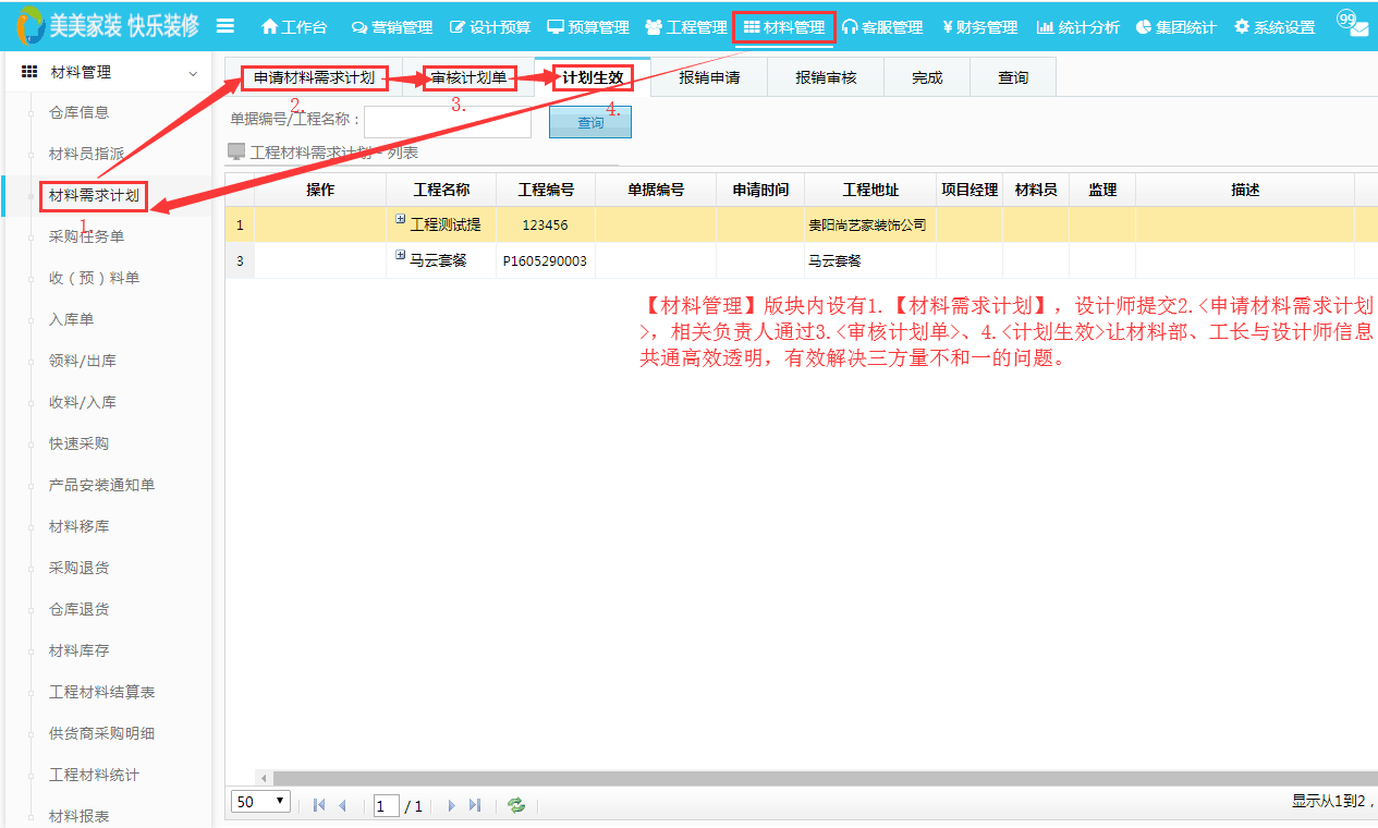美佳云裝系統(tǒng)優(yōu)化了對材料的管控,部門與部門之間實現(xiàn)精準(zhǔn)高效的信息互通,保證了項目順暢無誤的進(jìn)行。從源頭上保證了客戶的滿意度。設(shè)計師先提交<申請材料計劃>,相關(guān)負(fù)責(zé)人通過<審核計劃單>之后,<計劃生效>信息共通,保證預(yù)算量、結(jié)算量和開單量的三量合一。整個流程在系統(tǒng)內(nèi)就可以精確的溝通傳達(dá)并完成,大大的提高了工作效率,縮短了復(fù)雜的申報過程,審核時間。